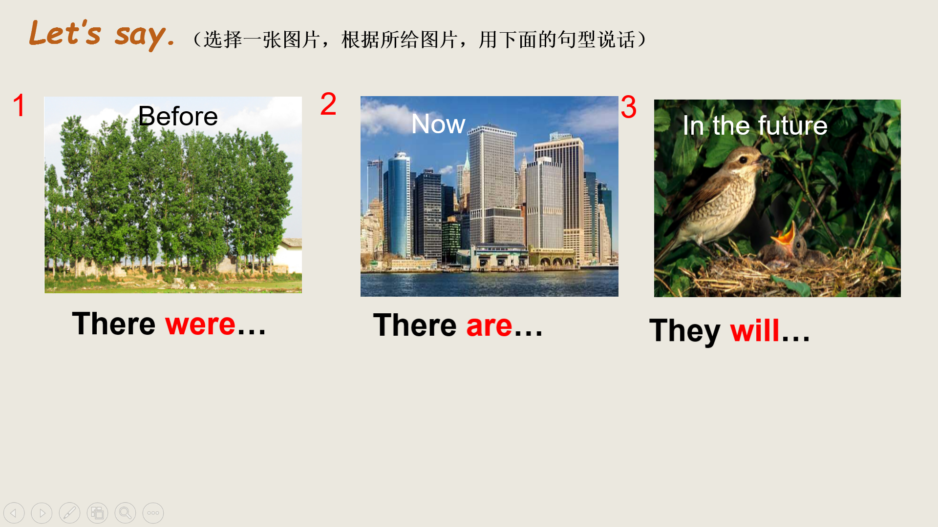 学生能够根据图片中的Before , Now , In the future很快地选出用There were… There are… They will…说话。