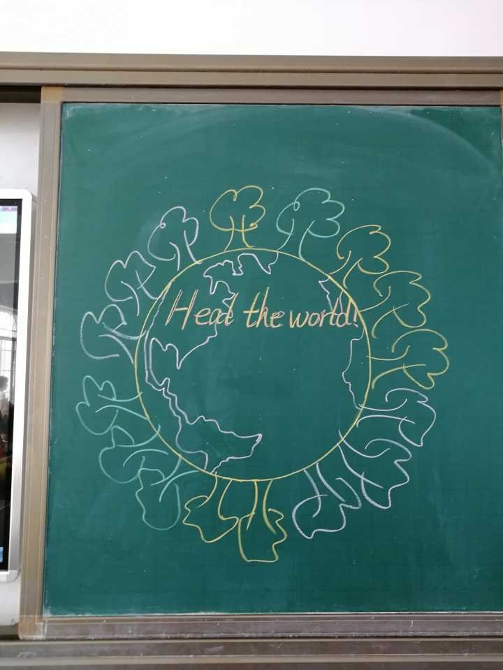 b、在游戏这个小高潮后,教师先肯定学生的出色表现,然后说:As a reward ,let’s enjoy a song .课件播放音乐Heal the world,教师相机指导heal the world的意思及读法,边读边做动作(两手举起做保护地球状)。然后教师说:The world is our common home. Do you want to heal the world? When you finish a task, you will plant a tree for the world . 教师在黑板上地球的简笔画上画出一棵树作为示范,让学生理解他们的任务,并激励学生保护地球,保护世界,保护我们共同的家园。