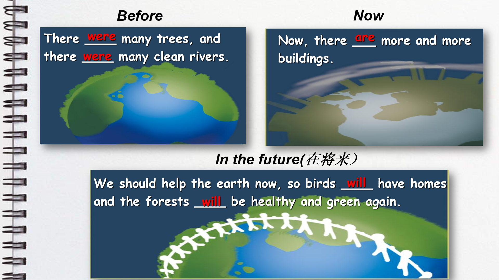 c、教师出示The earth 组图文,学生根据给出的时间用were, are, will填空。