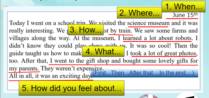 Student:(First...Then...After that ...In the end .../don't forget to express(表达) your feelings)