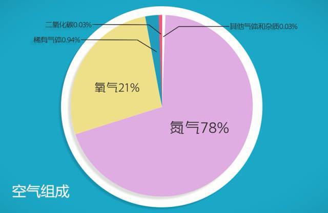 按体积计算:氮气78%、氧气21%、稀有气体0.94%、二氧化碳0.03%、其他气体和杂质0.03%