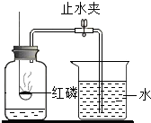 足量的红磷燃烧后,耗尽了集气瓶中的氧气,生成固体五氧化二磷;燃烧停止,温度降低后,瓶内压强减小;当打开弹簧夹时,烧杯中的水在大气作用下,流进集气瓶,增补了空气中氧气的体积。