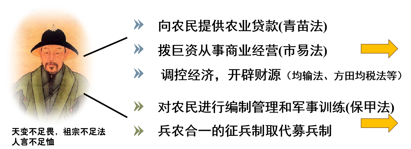 教师:1069年在宋神宗的支持下,王安石意图以“大有为”方式从根上解决宋代建国以来积累的问题,当时反对派以“天变不足畏,祖宗不足法,人言不足恤”对其诘难。王安石坦然接受“三不足”言论并以此表明自己改革的决心。通过预习我们知道王安石变法的原则是国家加强国家的管理和控制。在具体的变法措施中主要有这么几条,我们一起看看。第一大块主要是调控经济,开辟财源,第二大块主要是军事方面。大家思考一下,这些措施的目的是什么呢?![]()