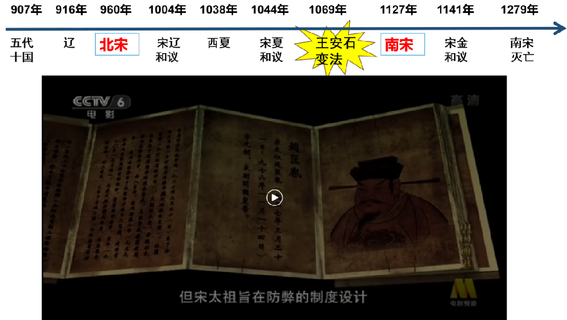 (设计意图:采用问题探究式教学,解决变法的背景问题。剪辑纪录片《中国通史》关于王安石变法的部分片段, 迅速抓住学生们的眼球,吸引注意。时间轴的展示便于学生在特定的时空框架下理解变法,增强学生的时空观念。)
