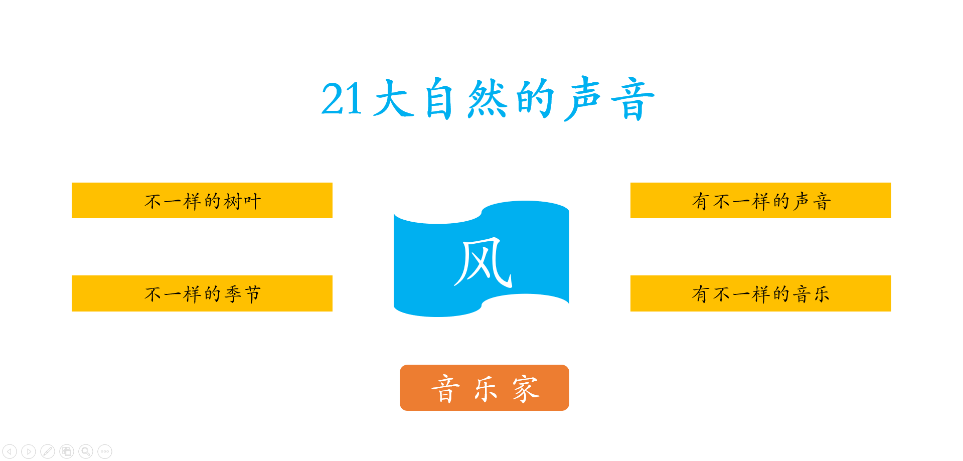三年级的学生能够联系生活实际,对声音进行一定程度的辨识和模仿,但是在通过语言文字感受大自然美妙声音上还需要进一步引导。可以借助多媒体等现代化技术,给学生搭建好桥梁,通过品读文本,了解“不一样的树叶,有不一样的声音;不一样的季节,也有不一样的音乐。” 从而理解中心句:风,是大自然的音乐家,进一步感知总分的结构。可以结合描写风的古诗,将描写微风与狂风的句子改成现代诗,让孩子在对比中感受课文语言之美。
