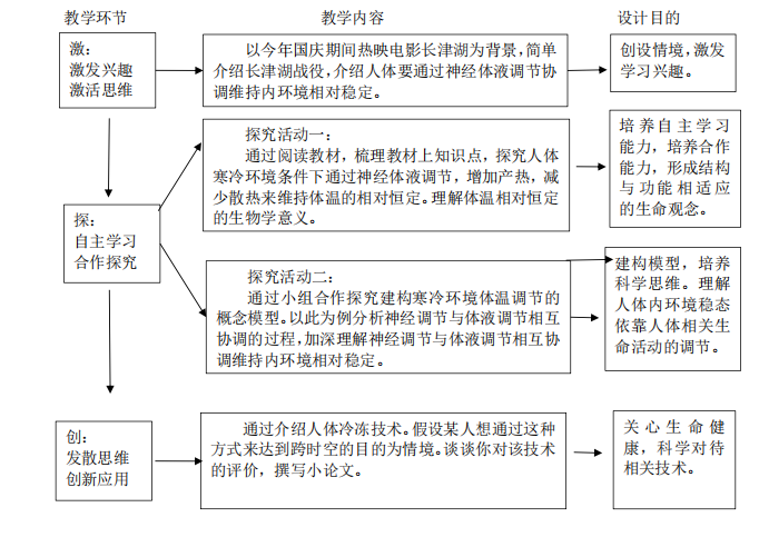 以国庆期间热映电影《长津湖》中片段作为情境贯穿整个教学过程。首先以与冰雕连相关一个视频导入新课,引起学生的情感共鸣。让学生理解到我们今天的幸福生活来之不易,接着讨论志愿军战士在寒冷环境条件过程中体温调节的。