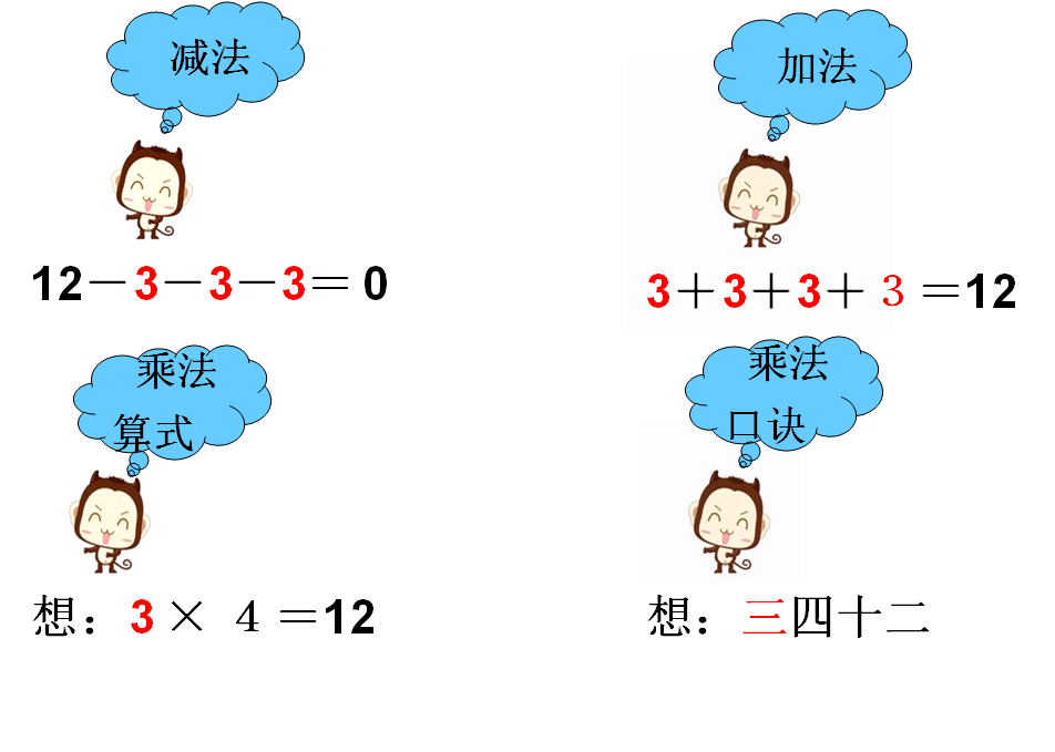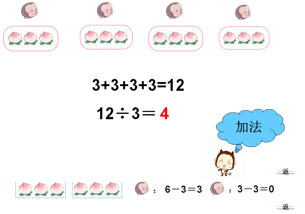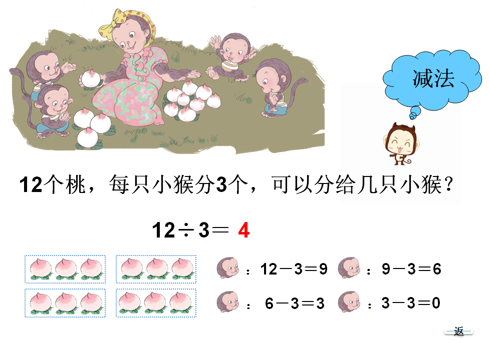 生1:我们用的是减法,12个桃,每只小猴分3个