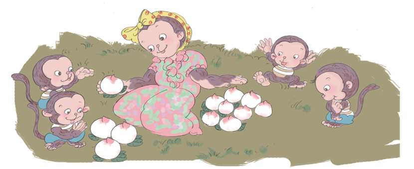 它摘了很多的桃子,带着妈妈和其他小猴子,来到草地上准备美美地野餐呢!(出示图片)
