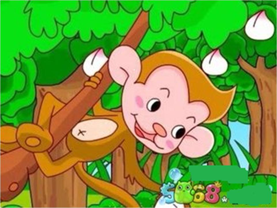 师:果园里不止苹果大丰收,果园里的桃子也大丰收了,小猴子又来凑热闹了,瞧(出示)