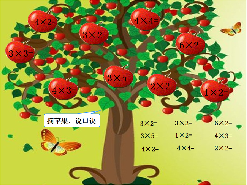 尤其是苹果树,上面的果子真是又大又红。(出示图片)请看问题:摘苹果,说口诀
