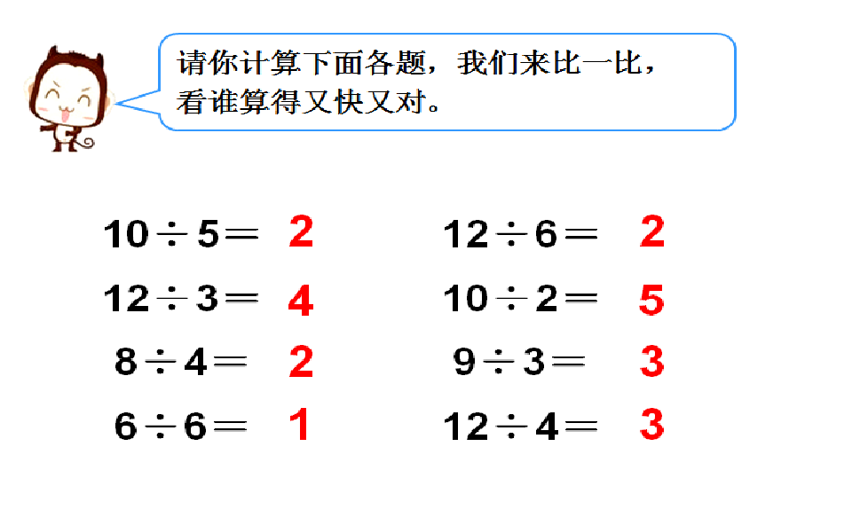生3:我们想的是乘法口诀,我们在计算12÷3时,就想乘法口诀“三四十二”,直接求出12÷3=4(出示课件)