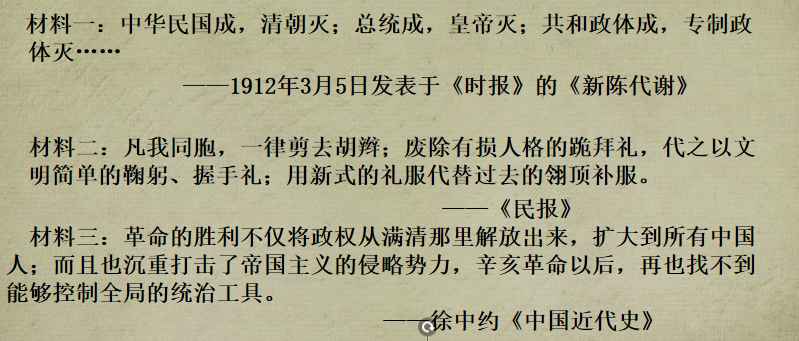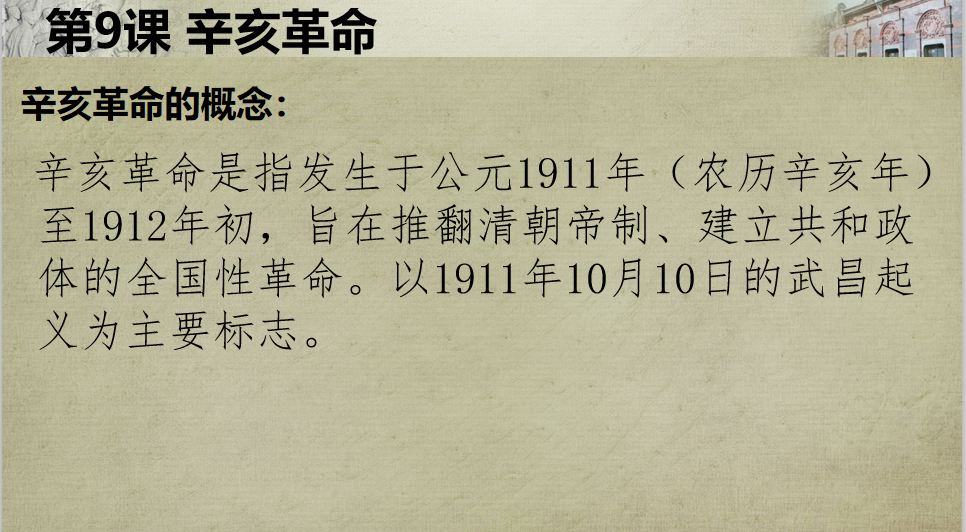 清王朝最终是被推翻了。1911年在农历属于辛亥年,所以我们把这次推翻清政府的革命称之为“辛亥革命”。出示辛亥革命概念: