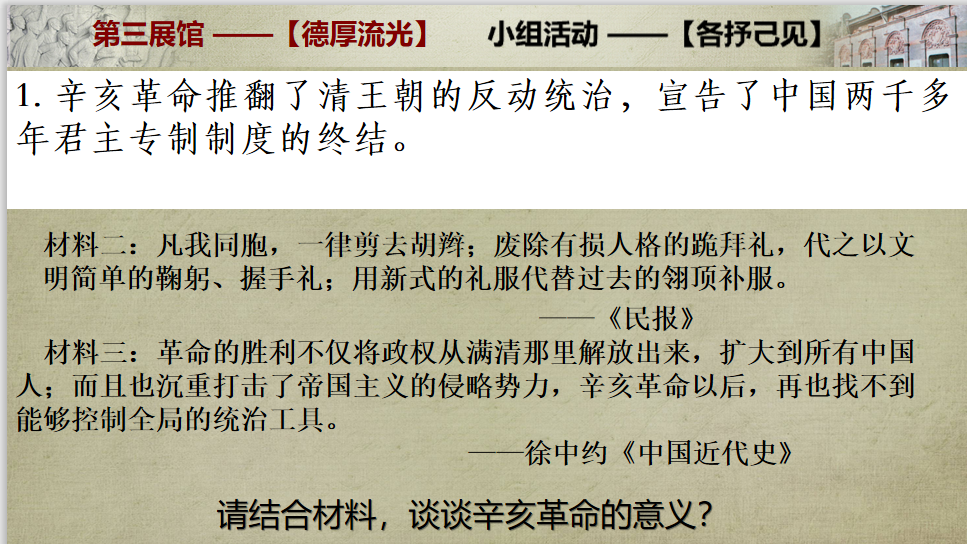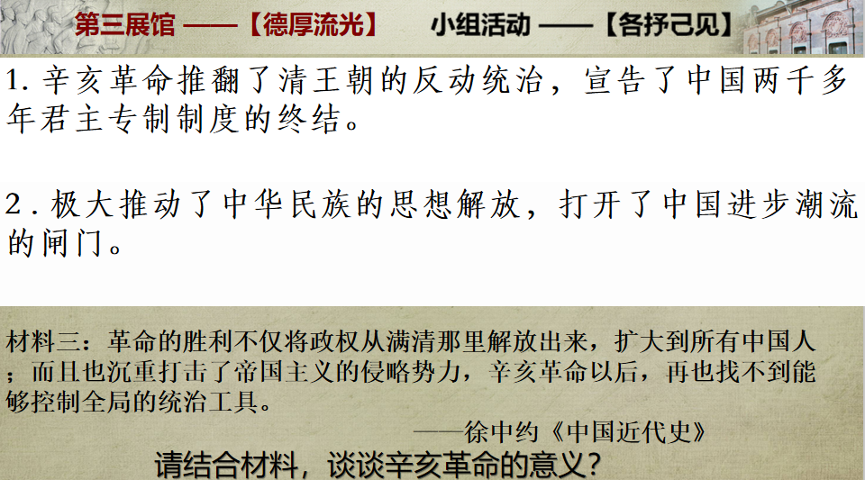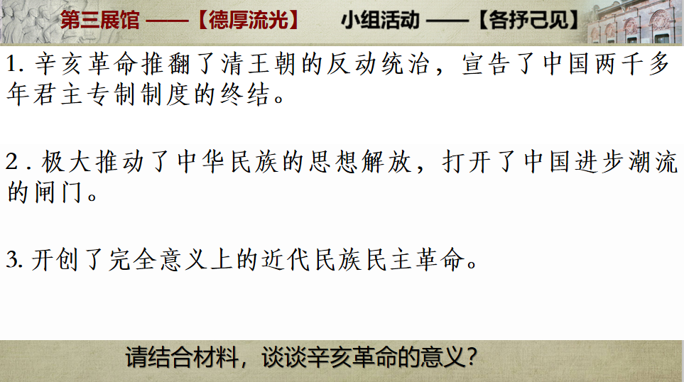 “辛亥革命”作为中国历史上开天辟地的大事,对当时的中国带来什么样的影响呢?下面请我们走进第三展馆——德厚流光,一起来分析下辛亥革命的意义。
