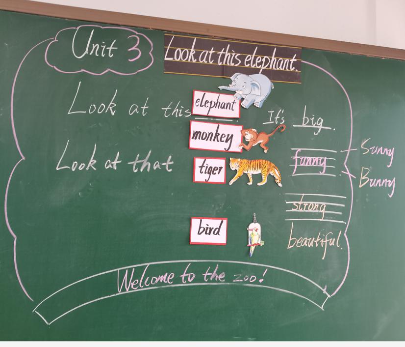 本课选自湘少版(三年级起点)四年级上册 Unit3 Look at this elehpant. 的第一课时。学生在三年级时已经学过一些关于动物的单词, 如cat, horse, dog... 。在复习有关动物名词的情况下,着重在句型中用形容词来描述动物的特征,有助于新旧知识的衔接。句型 Look at... 在三年级下册第四单元已经学过。It’s ... 三年级上册第七单元也已经学过。通过学习,学生能掌握动物的名词以及大胆用英语表达,描述所见物品的能力。