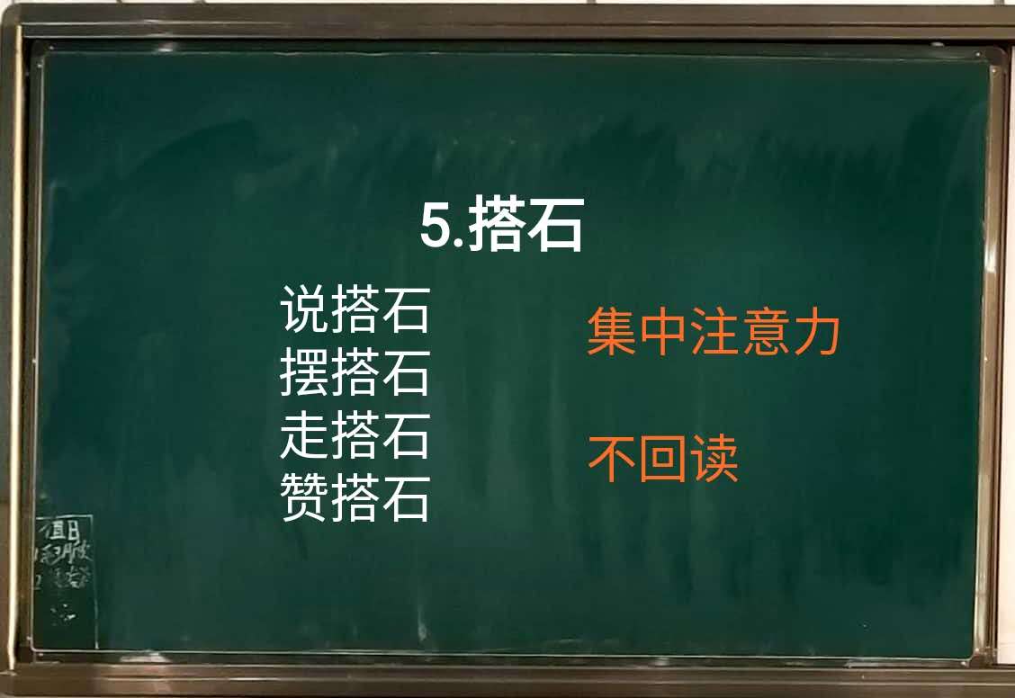 1. 同学们,这节课我们继续来学习第五课:《搭石》(板书课题),上一节课在吴老师的带领下我们训练了快速阅读的方法,你们有哪些阅读上的体会和收获?