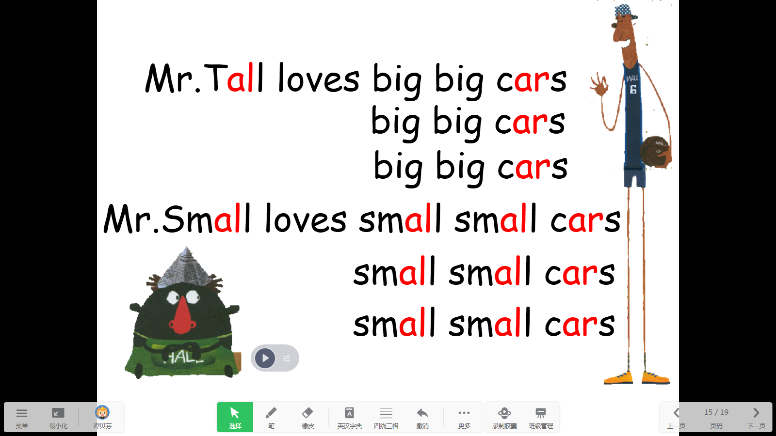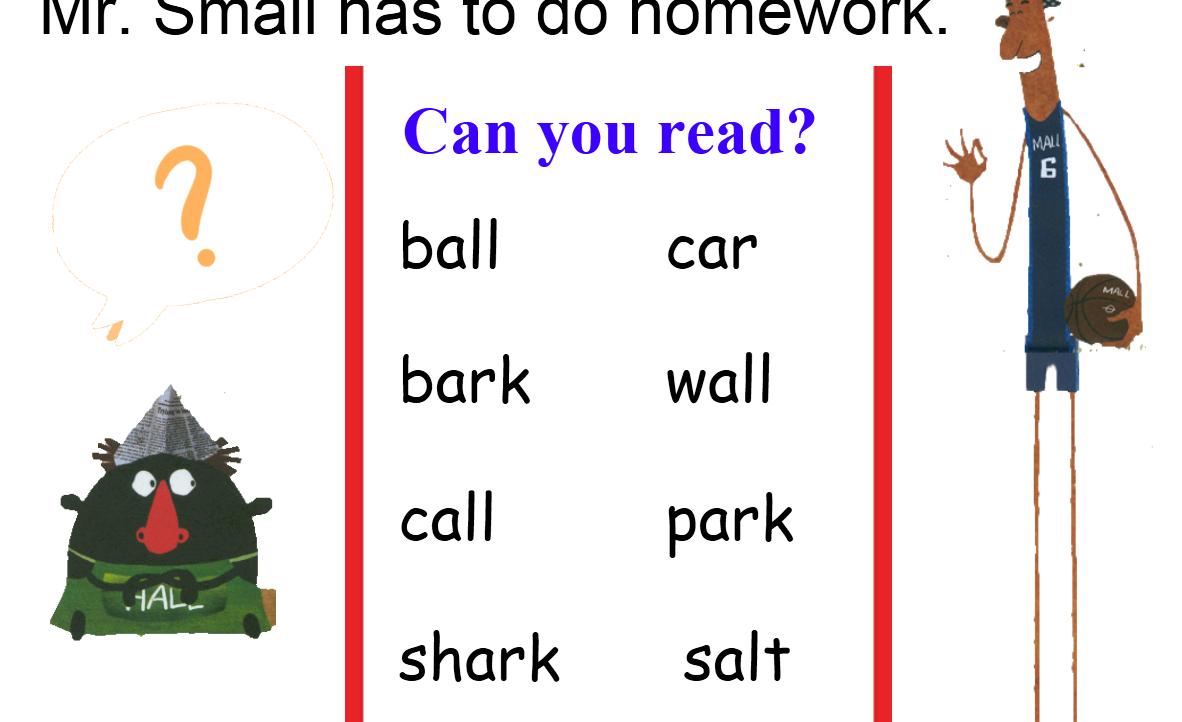 【设计意图】Mr.Tall and Mr.Small正在完成朗读作业,可是他们不会读,那么同学们你会读吗?学生会看到许多含有ar和al的单词,有以前学过的,也有没学过的生词。 教师鼓励学生运用自然拼读法,大胆拼读。