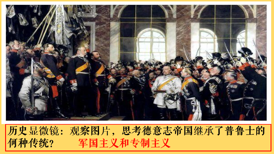 老师:从图片的这些细节,我们能看出成立的德意志帝国继承了普鲁士的哪些传统呢?生:军国主义和专制主义(用希沃班级优化大师抽取学生回答,并点评。在学生回答时,慢慢用橡皮擦擦去答案上设置的蒙层。)