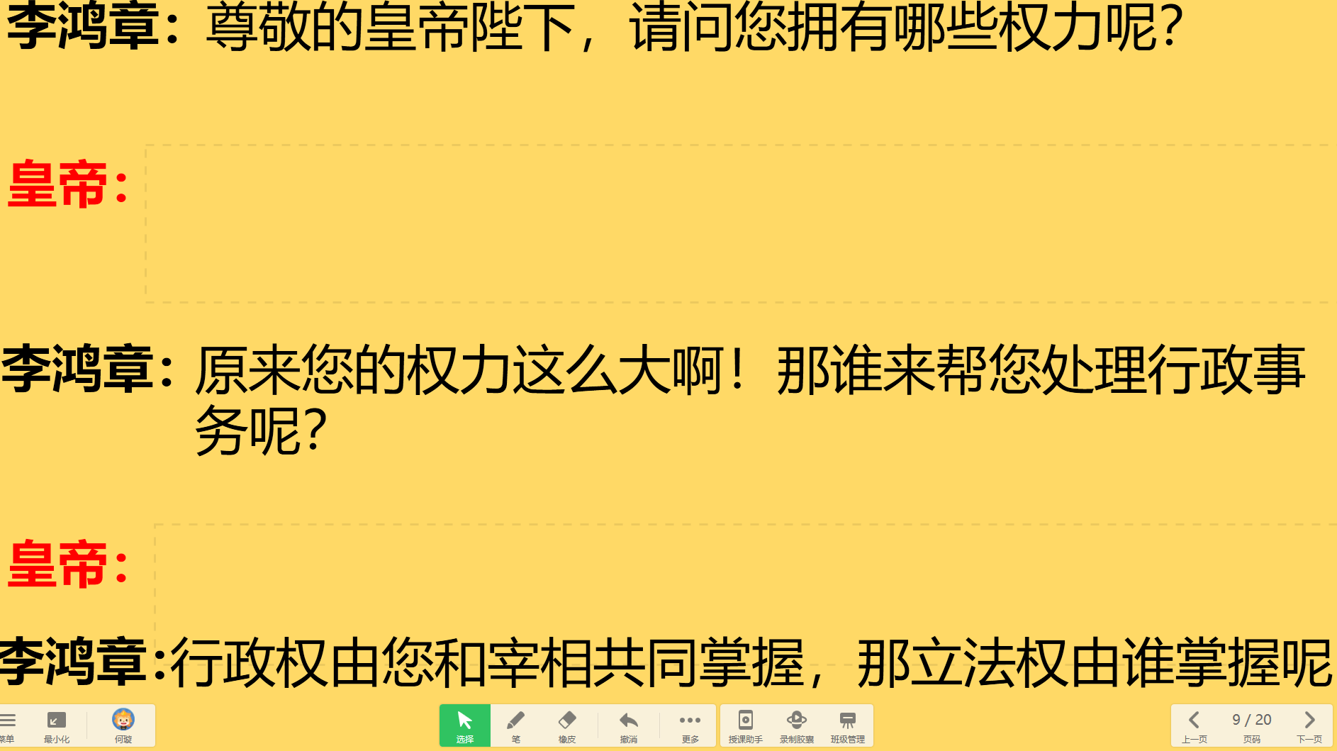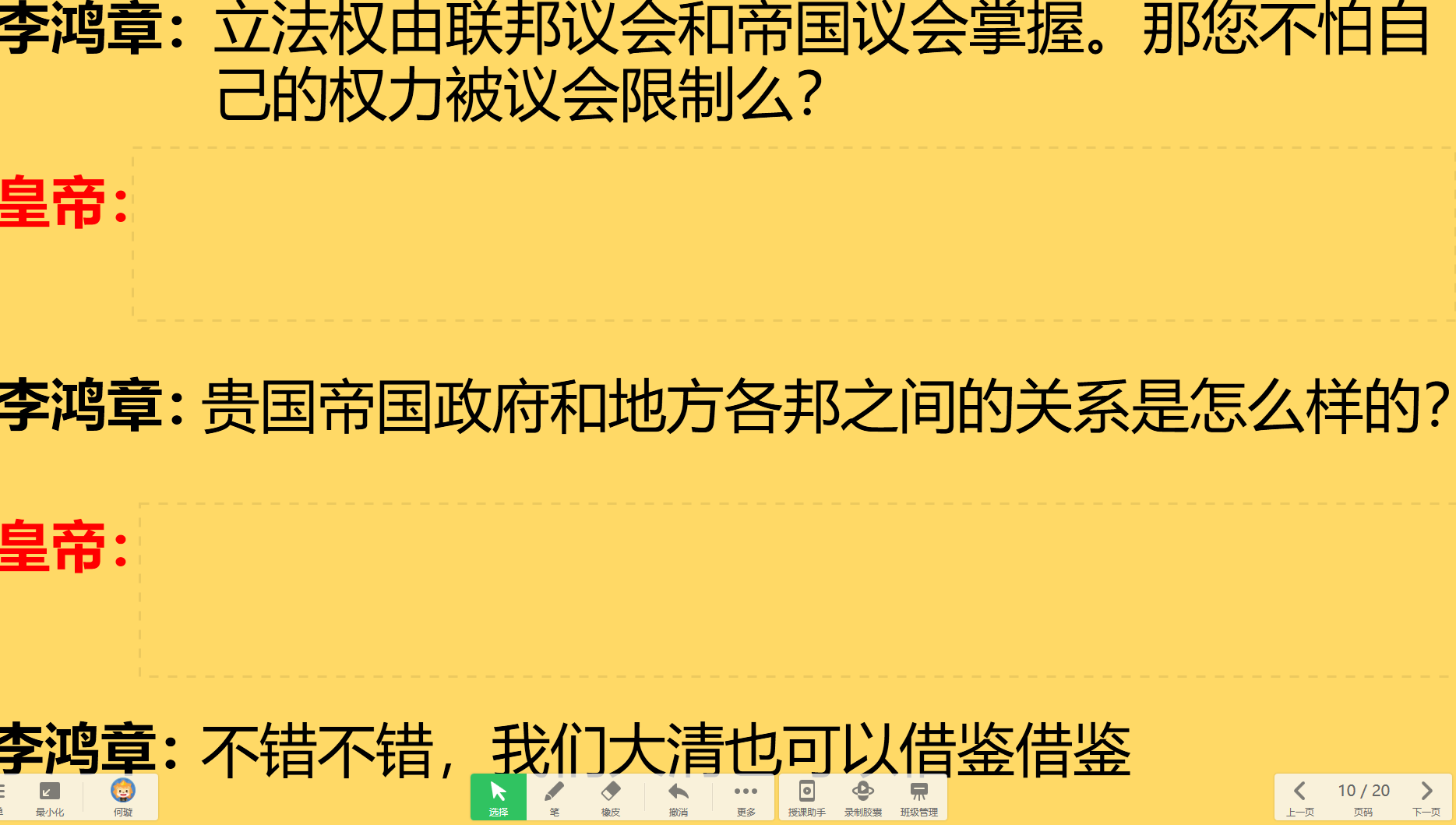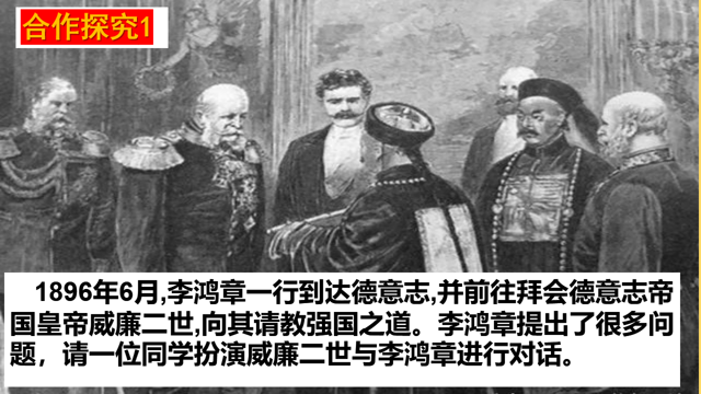 老师:1871年在德意志完成统一后,德意志颁布了《德意志帝国宪法》正式确立起了君主立宪制政体。课前我布置了同学们阅读了学案上关于《德意志帝国宪法》的材料,下来我们通过角色扮演来检测一下同学们预习的成果。1896年李鸿章一行到达德意志,并前往拜会德意志帝国皇帝威廉二世,李鸿章提出了很多问题,我来扮演李鸿章,请一位同学扮演皇帝来回答李鸿章的问题。