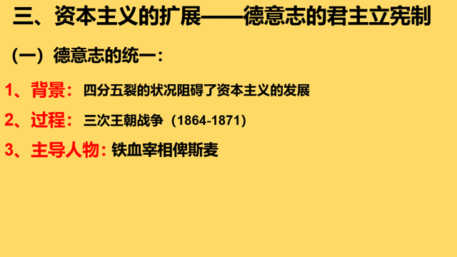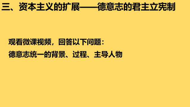 1、观看提前制作的微课视频,老师:首先请同学们观看一段微课视频,回答以下三个问题。(PPT展示德意志统一的背景、过程、主导人物)播放完视频后,老师:看完了视频,那德意志为何要去完成统一呢?学生:四分五裂的状况阻碍了德意志资本主义的发展。老师:过程是?学生:三次王朝战争 ;老师:是在哪位杰出人物的主导之下完成的?生:俾斯麦。(设计意图:通过制作微课,可以更好的利用地图和视频结合讲解,更加生动,并且也可以节省时间,更加高效的完成教学任务,可以提升学生的自主学习能力,可以在较短的时间内迅速的让学生掌握简单的基础知识,为之后的合作探究做铺垫。)