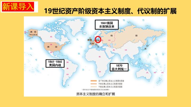 展示19世纪资产阶级资本主义制度、代议制的扩张地图。老师:同学们,我们之前讲到,19世纪资本主义制度扩展到了更多的国家:美国、俄国、甚至连德意志都完成了统一,确立了资本主义制度。那此时的德国又是怎样的状况呢?我们通过第九课中的德意志的君主立宪制这一部分来找出答案。(设计意图:通过回顾所学知识,激发学生的兴趣,并且与本单元的主题:资产阶级革命与资本主义制度的创立联系起来,体现单元内容的完整化和体系化)