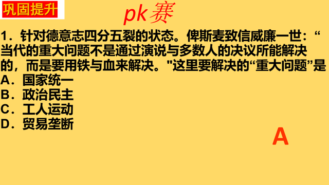 老师:最后我们将全班分成两大组,一二大组和三四大组各派一名同学来进行PK赛。看谁能做得又快又好。(推选上来的两个学生用希沃的做题活动进行PK)(设计意图:①设置三个学考真题,检测学生的学习成果,巩固本堂课的学习成果。②题目选择上,考察点主要针对德意志统一的背景、德意志君主立宪制的评价等,突出重难点。③利用PK活动的方式,提升对抗性,激发学生的学习兴趣,分组竞争的方式则可以激发学生的集体荣誉感。)
