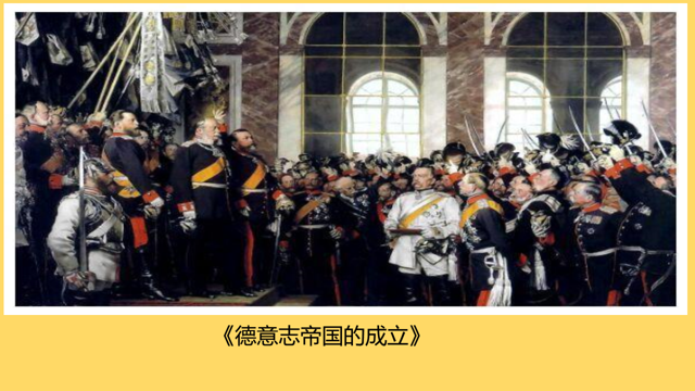 接下来展示《德意志帝国的成立》的图片,老师:军国主义是指崇尚武力和对外扩张,那同学们看能否从图中找出军国主义色彩。(用希沃放大镜功能展示军人的军服和刺刀,引导学生理解德意志的军国主义色彩。)