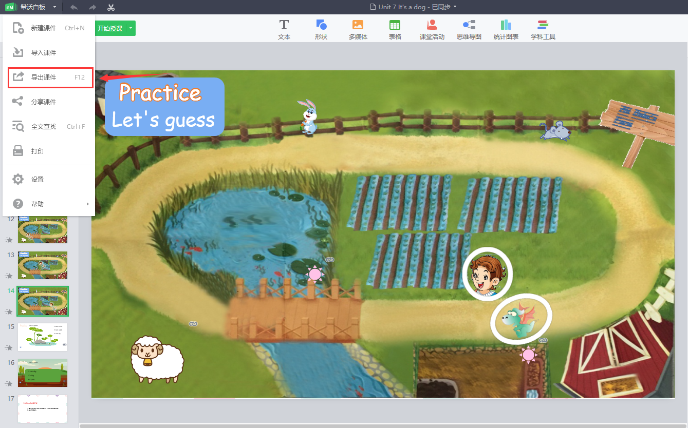 1.使用希沃白板打开课件,点击左上角“希沃白板”打开菜单栏,选择“导出课件”;